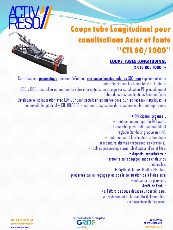 Cette machine pneumatique permet d’effectuer une coupe longitudinale de 500 mm rapidement et en toute sécurité sur les tubes Acier ou Fonte de Ø80 à 1000 mm. Utilisé notamment lors des interventions en charge sur canalisation PE, préalablement tubée dans des canalisations Acier ou Fonte. Développé en collaboration avec EDF-GDF pour sécuriser les interventions sur les réseaux métalliques, le coupe-tube longitudinal « CTL 80/1000 » est une transposition des machines outils contemporaines.