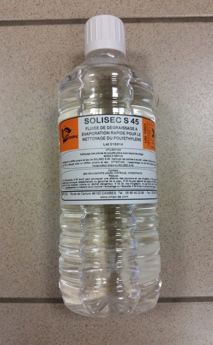 FLUIDE DE DEGRAISSAGE POUR LE NETTOYAGE DU PE Solvant pour le nettoyage des pièces PE avant électrosoudage Bidon d’un litre