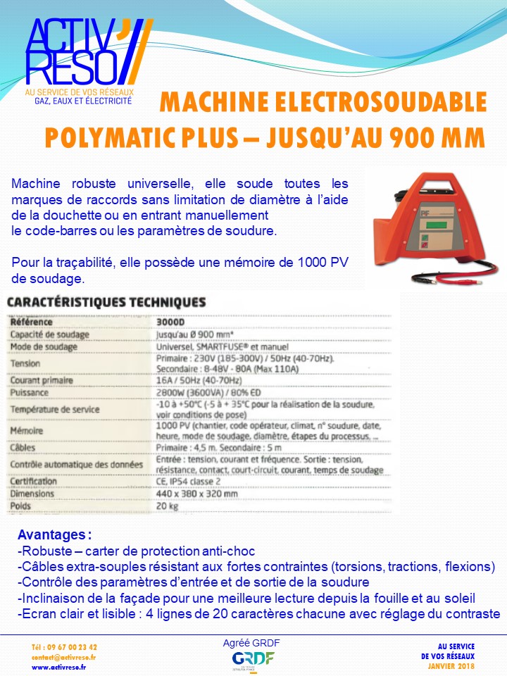 Cette machine à souder modèle Polymatic Plus permet d’électro-souder des pièces PE de Ø 20 à 900 mm, elle est agréée GRDF.